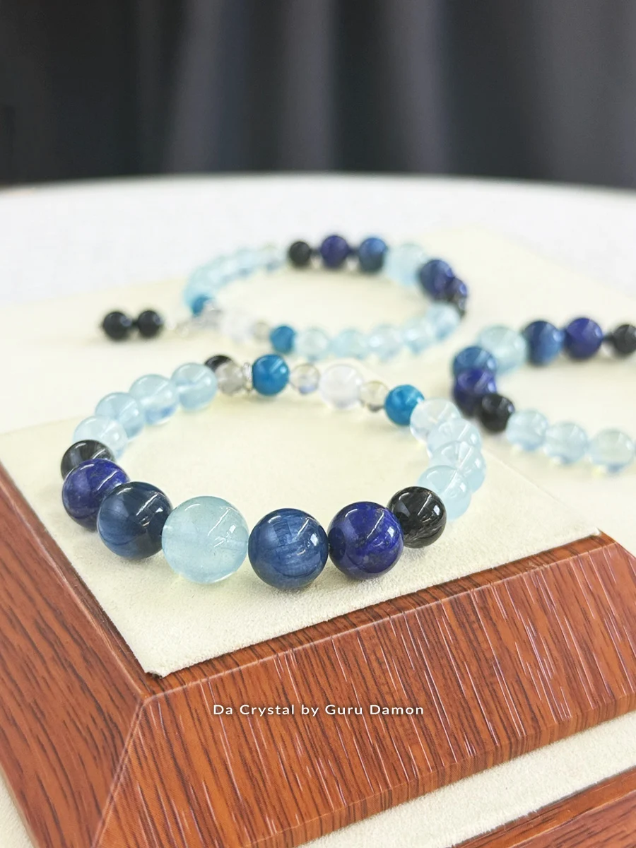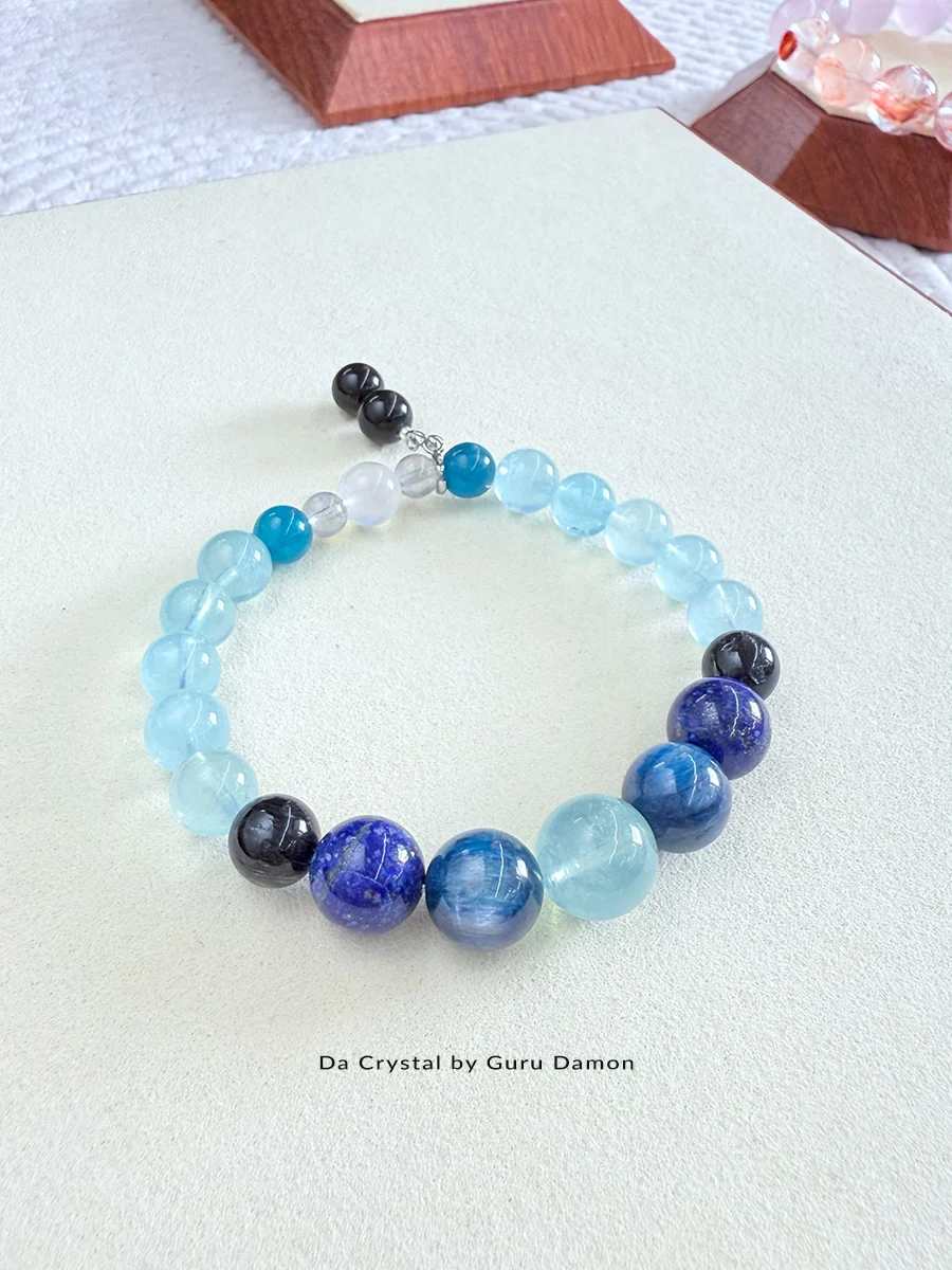 SEIS Crystal Bracelet is a powerful blend of eight harmonising crystals —Aquamarine, Kyanite, Lapis Lazuli, Black Rutile, Blue Apatite, Labradorite, Moonstone, and Gold Obsidian